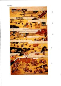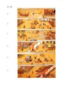 第1幅は、「仏教の伝来」として、一光三尊仏像がインドで生まれ、朝鮮の百済に渡り、日本へ渡るかが描かれています。話は、下の段から上の段へ(①から⑥)に描かれている。
